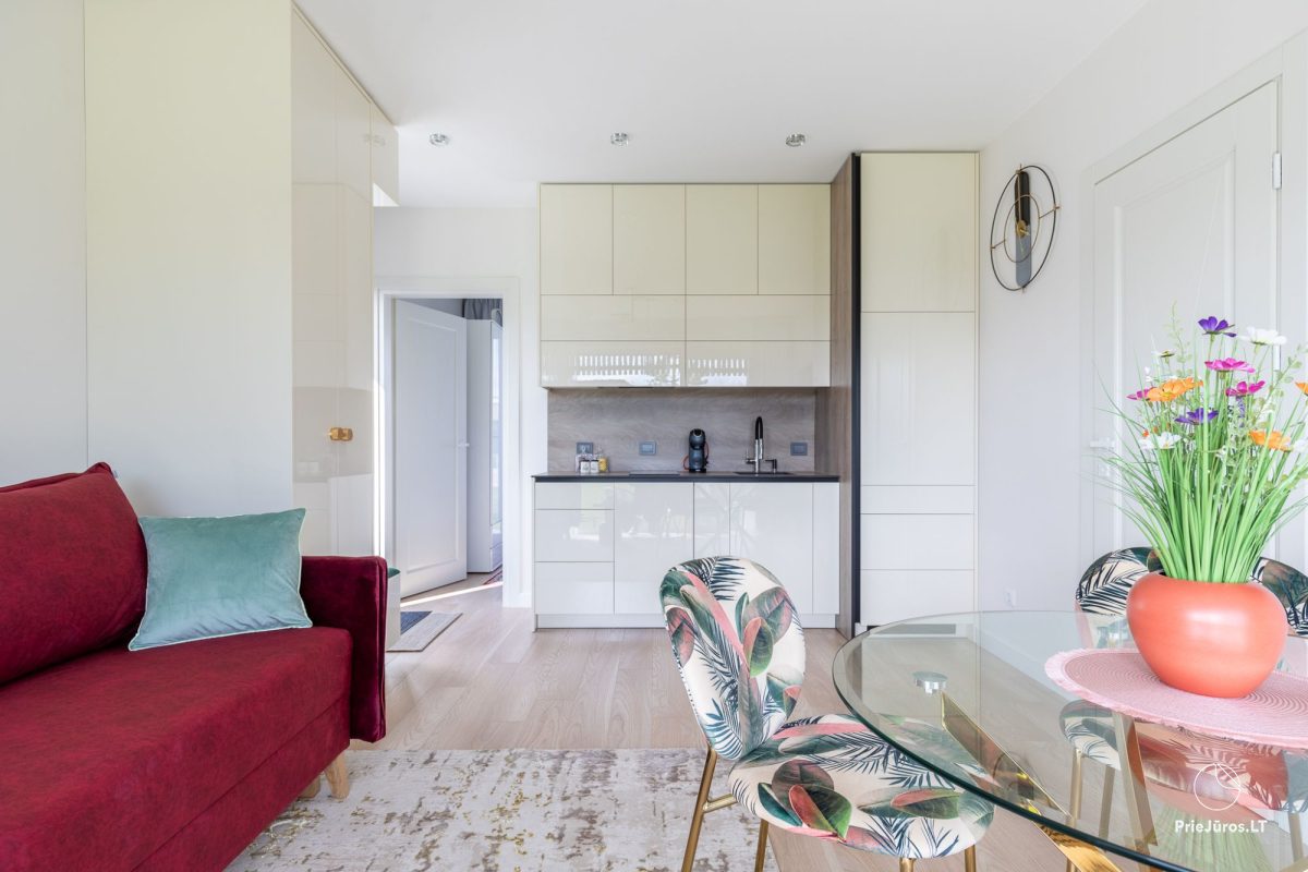 Jaukūs ir modernūs „Sea Drop“ apartamentai Kunigiškiuose, 40 kv. m, patogiai talpinantys iki 4 svečių. Apartamentuose rasite miegamąjį, svetainę su miegama sofa, pilnai įrengtą virtuvę ir visus reikalingus patogumus.